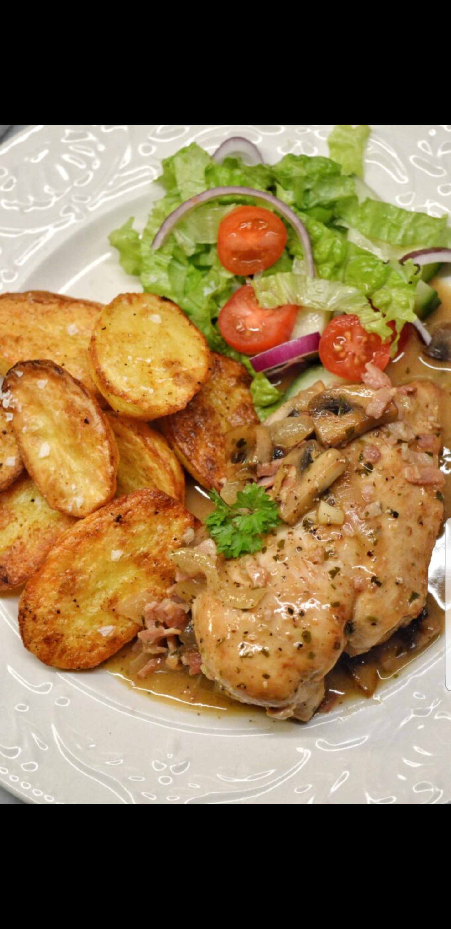 Kycklingfilé med stekt potatis och bearnaisesås isbergssallad tomat gurka lök