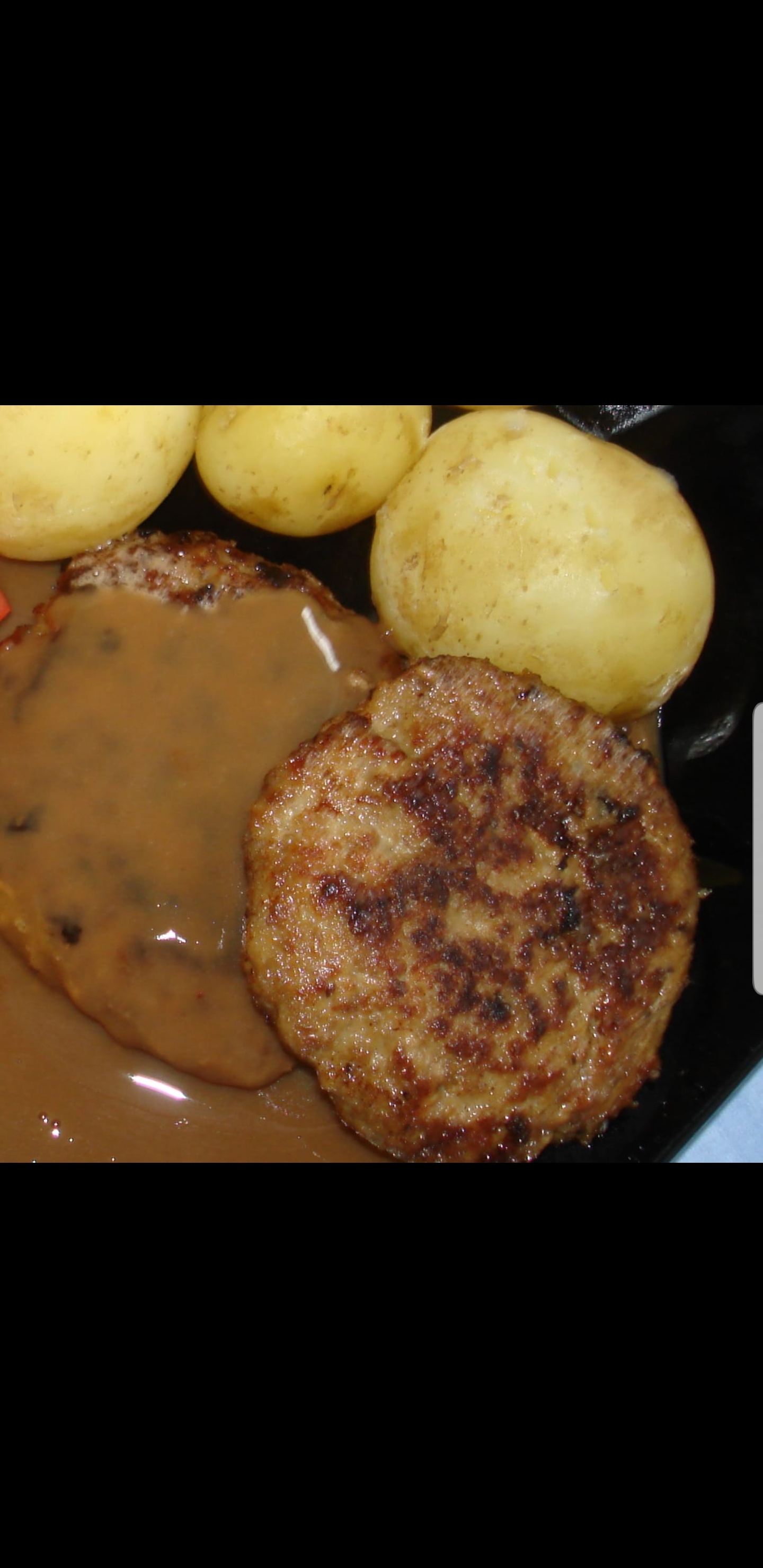 Pannbiff med stekt potatis och brunsås isbergssallad tomat gurka