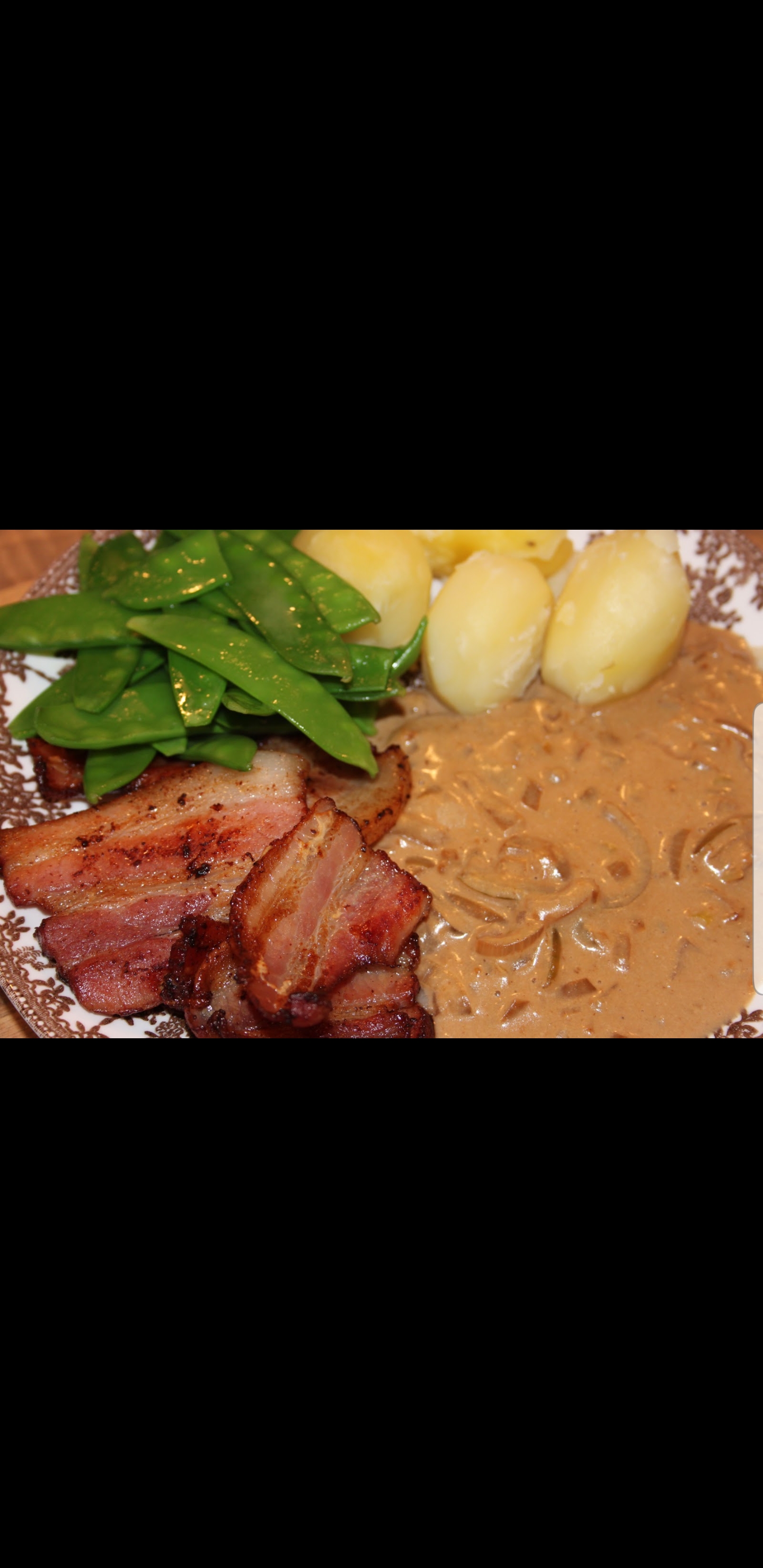 Stekt fläsk med stekt potatis och löksås isbergssallad tomat gurka lök